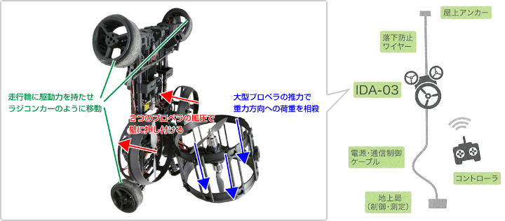 IDA-03は、プロペラの推進力と走行輪で、垂直な壁面を移動しながら打診検査を行う装置です。